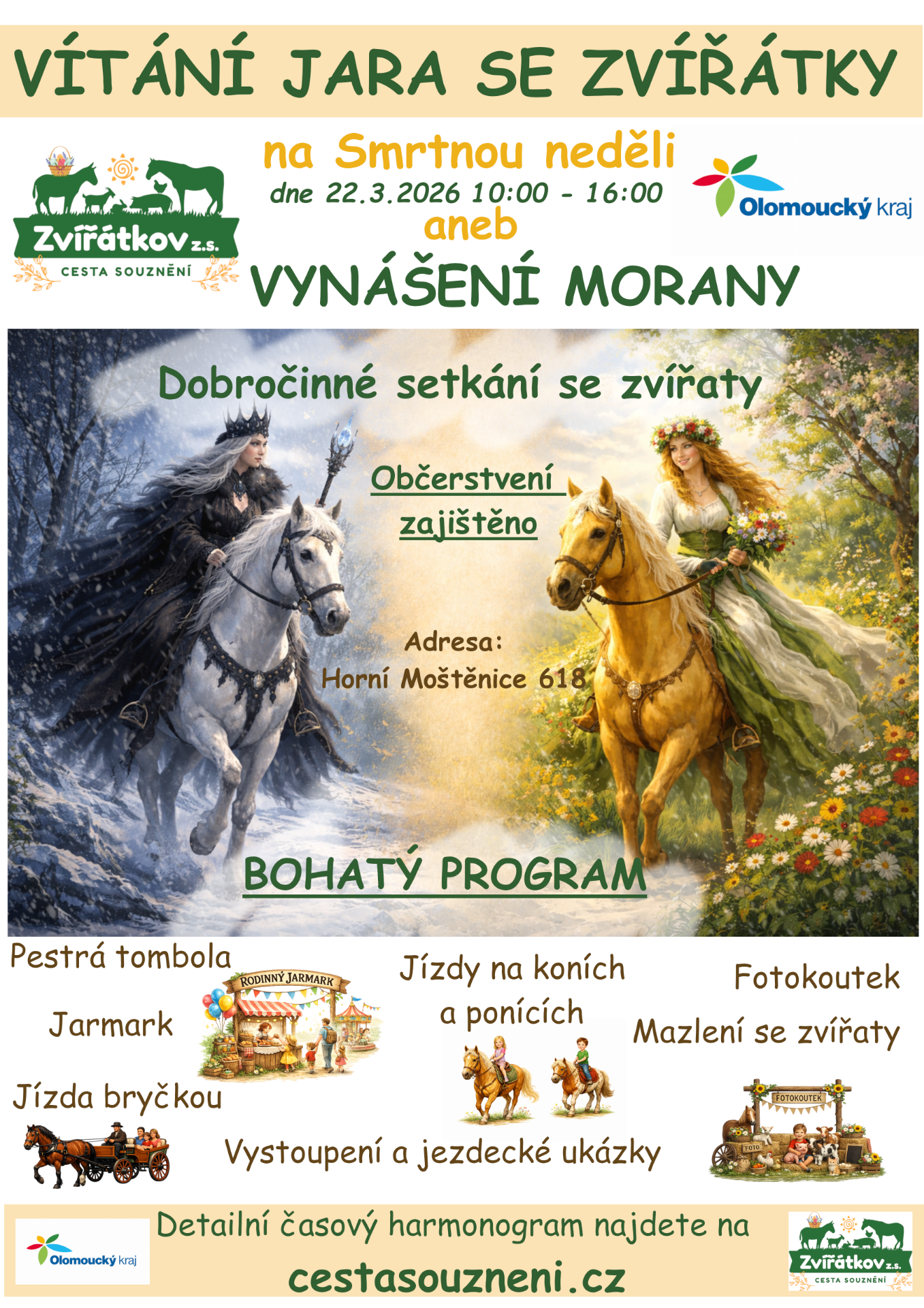 Morana a Vesna nebudou chybět stejně jako naše zvířátka, vození v bryčce, vození na koních a ponících, tematické představení, jezdecká ukázka, krmení zvířátek, mazlení, občerstvení (teplé jídlo i pití), tombola, fotokoutek, jarmark ... a možná ještě něco přidáme.